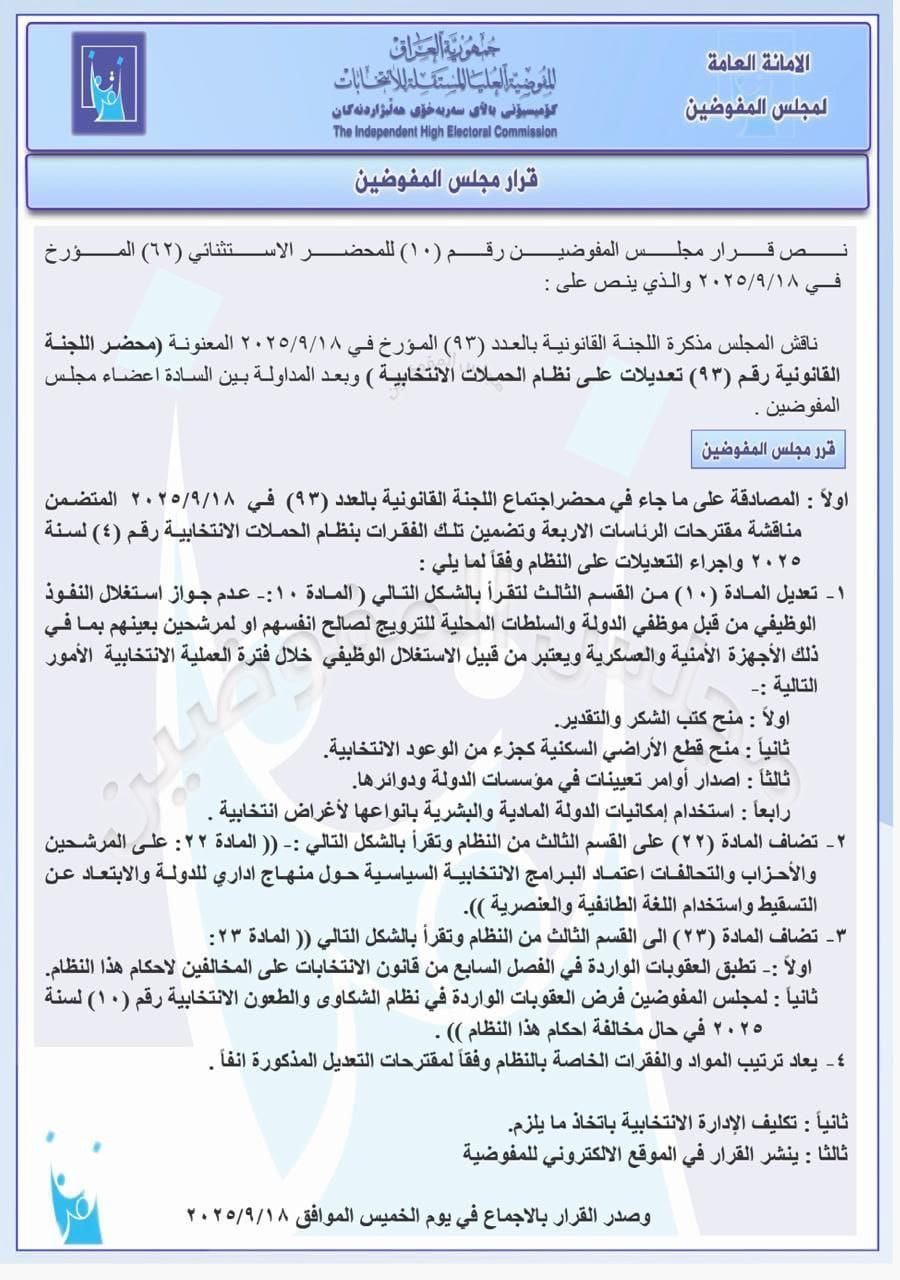 أصدرت المفوضية العليا المستقلة للانتخابات، اليوم الأحد، قراراً يقضي بتعديل نظام الحملات الانتخابية، وذلك في اجتماع لمجلس المفوضين عُقد يوم الخميس الموافق 18 أيلول/سبتمبر 2025.