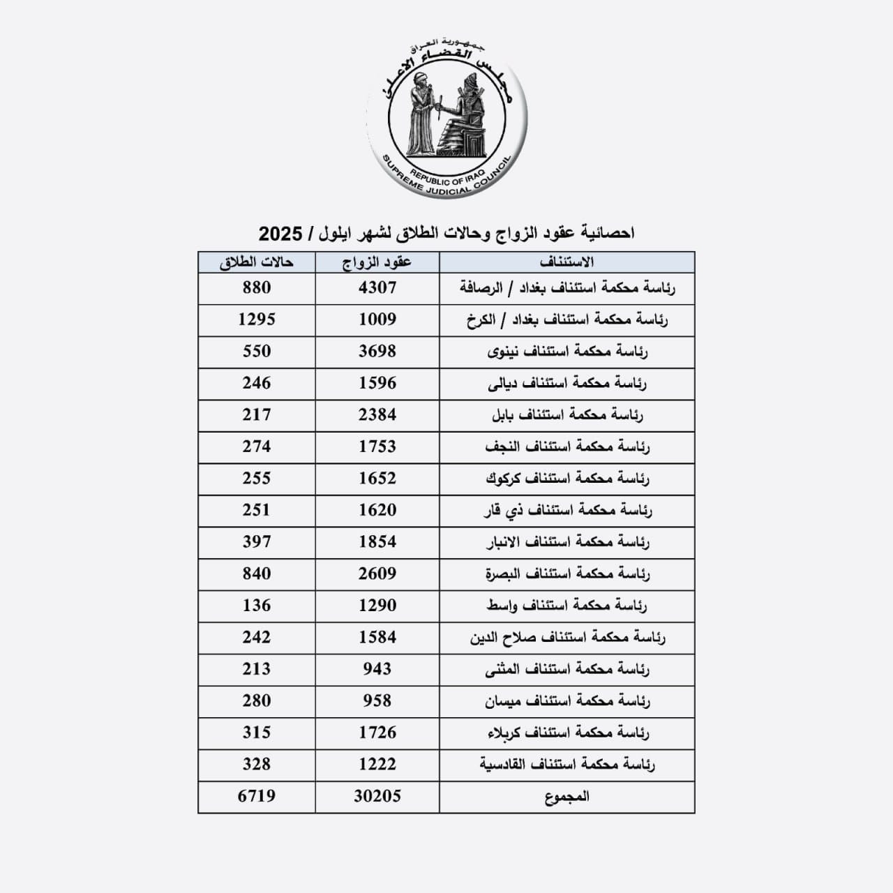 اخبار العراق إحصائية رسمية… (223) حالة طلاق يومياً في العراق خلال أيلول الماضي آخر تحديث 19/10/2025 صحيفة الناصرية الالكترونية: أصدر مجلس القضاء الأعلى، اليوم الأحد، إحصائية رسمية بعدد حالات الزواج والطلاق لشهر أيلول الماضي في بغداد والمحافظات وكما في أدناه: شارك هذا الموضوع: النقر للمشاركة على X (فتح في نافذة جديدة) X انقر للمشاركة على فيسبوك (فتح في نافذة جديدة) فيس بوك مرتبط أكمل القراءة