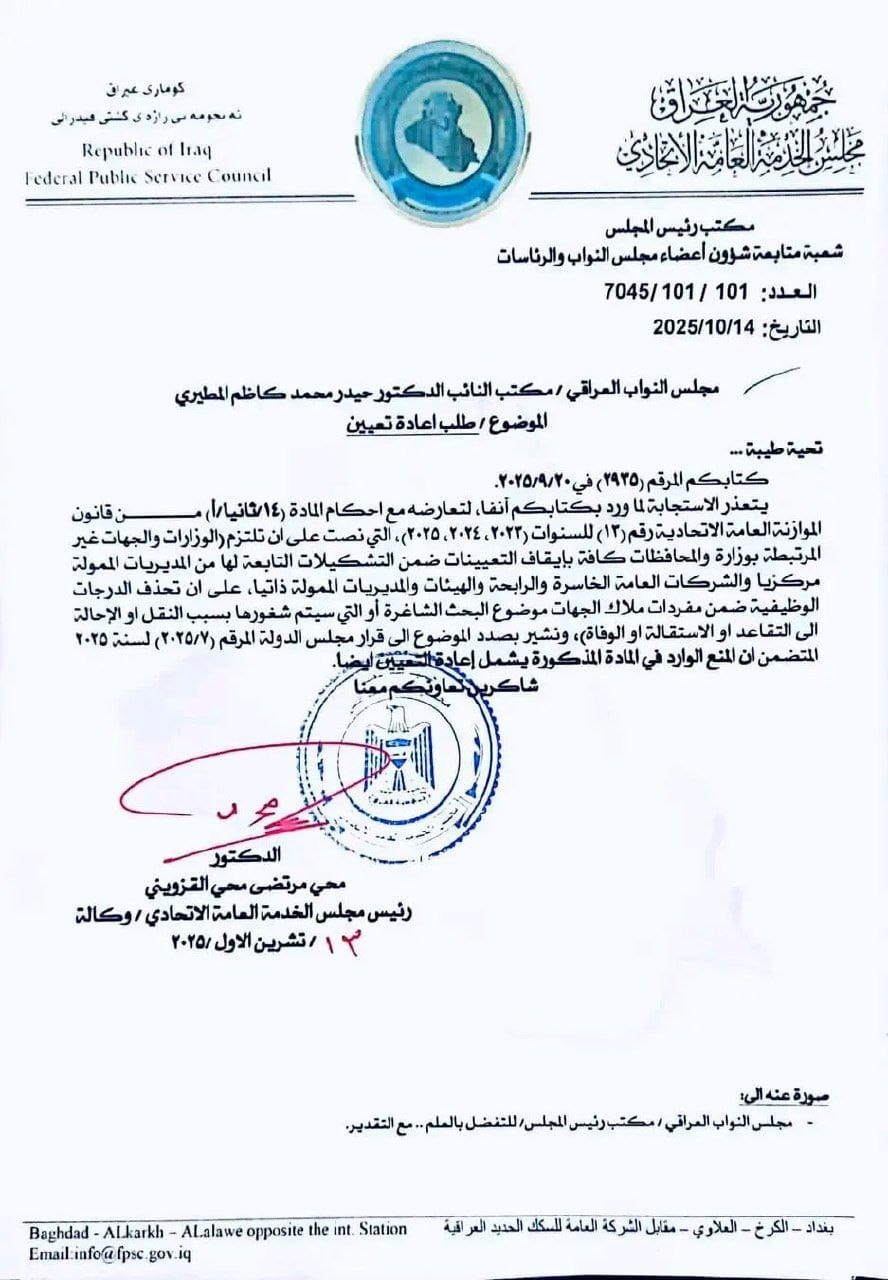 اخبار العراق مجلس الخدمة يوقف التعيينات في جميع مفاصل الدولة في 23/10/2025 صحيفة الناصرية الإلكترونية: أعلن مجلس الخدمة العامة الاتحادي، اليوم الخمس، عن إيقاف التعيينات في جميع مفاصل الدولة، استناداً إلى أحكام قانون الموازنة العامة الاتحادية للسنوات (2023 – 2024 – 2025). شارك هذا الموضوع: النقر للمشاركة على X (فتح في نافذة جديدة) X انقر للمشاركة على فيسبوك (فتح في نافذة جديدة) فيس بوك مرتبط أكمل القراءة