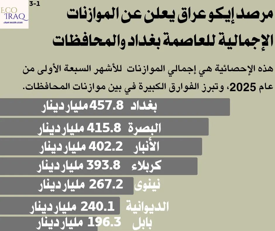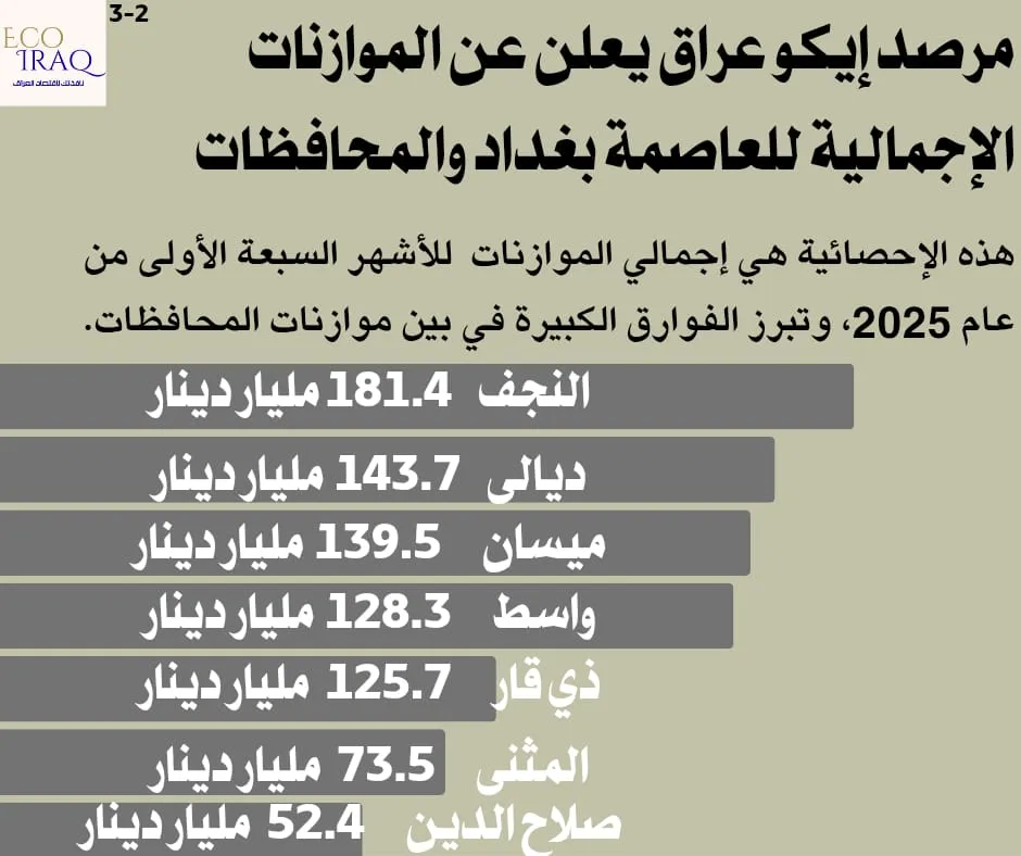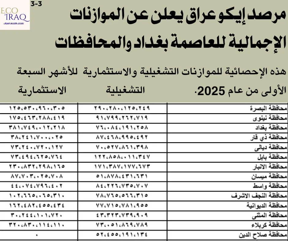 واعتبر “إيكو عراق” أن “الأرقام تعكس تفاوتًا تنمويًا واضحًا بين المحافظات العراقية، إذ تركز بعض الحكومات المحلية على النفقات التشغيلية، فيما تتجه أخرى نحو الاستثمار والبنية التحتية”، مؤكداً على “ضرورة اعتماد سياسات مالية أكثر توازناً لتحقيق تنمية عادلة وشاملة بين جميع مناطق البلاد”.