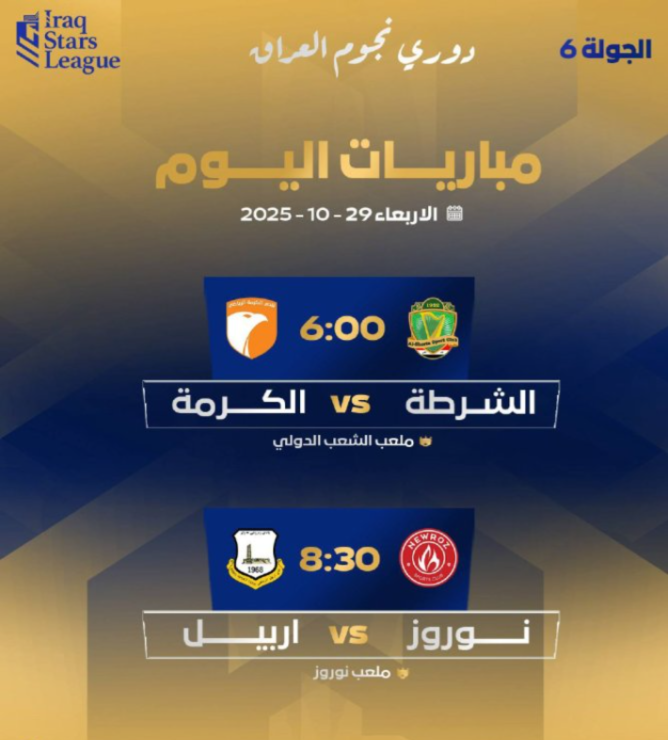 تنطلق، اليوم الأربعاء، منافسات الجولة السادسة من دوري نجوم العراق بكرة القدم، بإقامة مباراتين مرتقبتين.