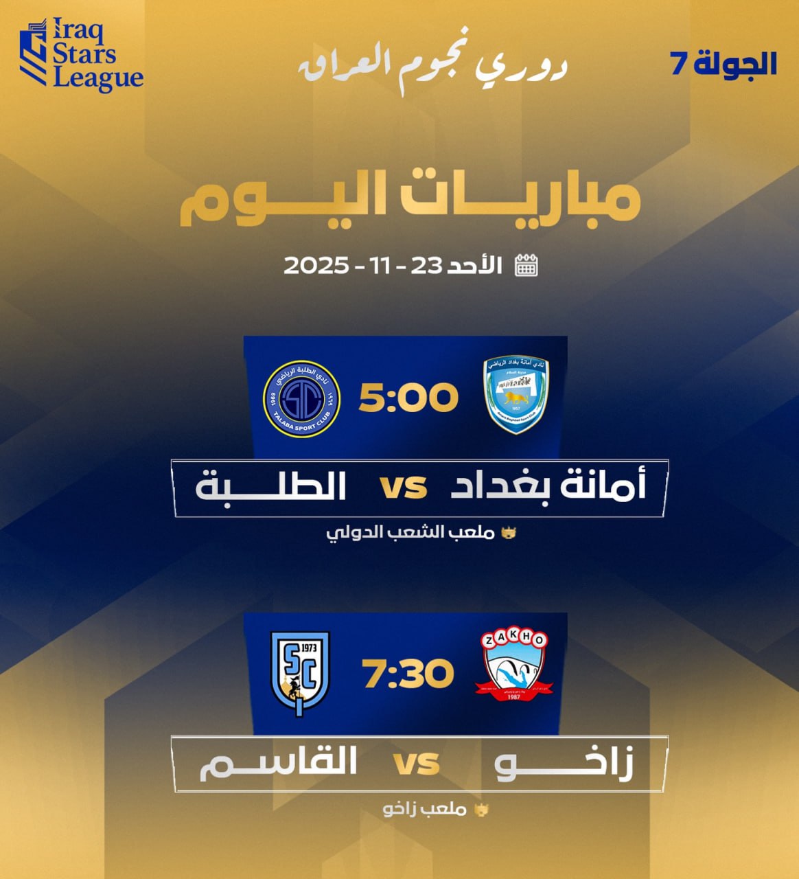 تختتم، اليوم الأحد، منافسات الجولة السابعة لدوري نجوم العراق لكرة القدم بإقامة مباراتين تقام الأولى عند الساعة الـ (5:00) مساء بين فريقي أمانة بغداد وضيفه فريق الطلبة، وتقام المواجهة على ملعب الشعب الدولي.