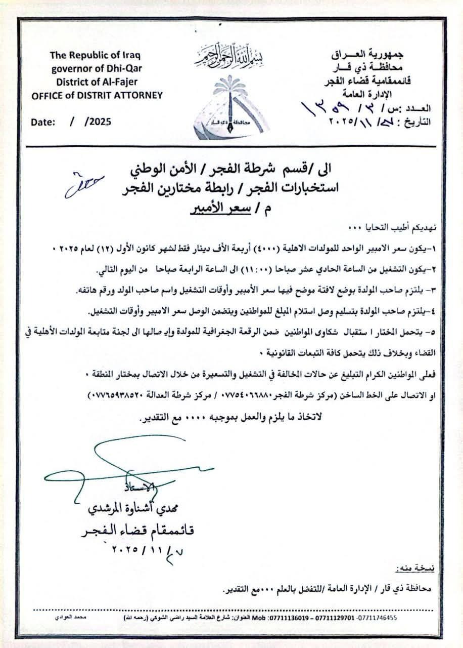 أخبار الناصرية قضاء الفجر يحدد سعر الامبير لشهر كانون الاول بـ(4) الاف دينار آخر تحديث 02/12/2025 صحيفة الناصرية الإلكترونية: حددت ادارة قضاء الفجر، سعر الامبير للمولدات الاهلية لشهر كانون الاول ب(4) الاف دينار فيما وضعت تعليمات وشروط وحذرت المخالفين. شارك هذا الموضوع: النقر للمشاركة على X (فتح في نافذة جديدة) X انقر للمشاركة على فيسبوك (فتح في نافذة جديدة) فيس بوك مرتبط أكمل القراءة