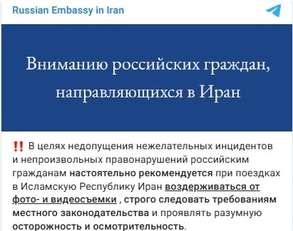 أوصت سفارة روسيا في طهران المواطنين الروس المسافرين إلى إيران بالامتناع عن التقاط صور أو تسجيل مقاطع فيديو أثناء تواجدهم في البلاد.
